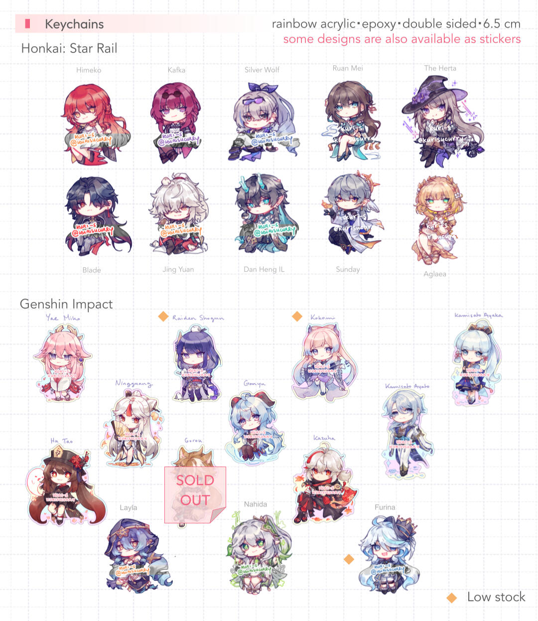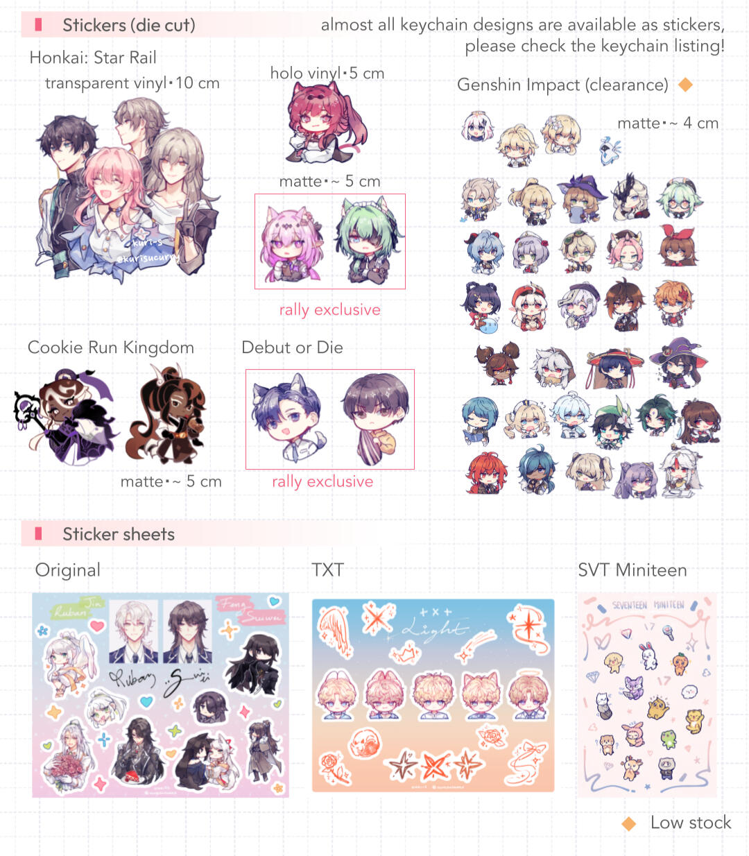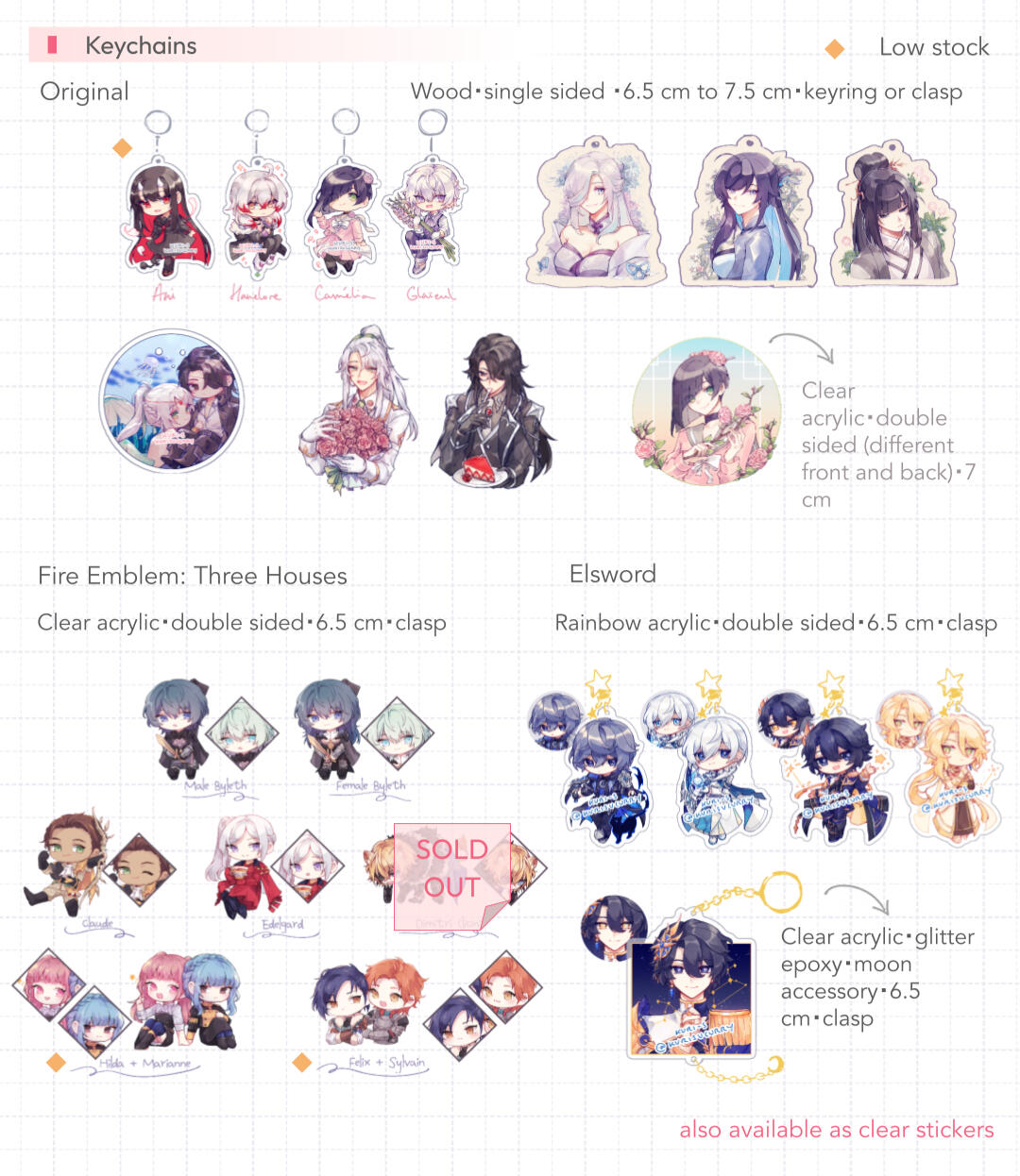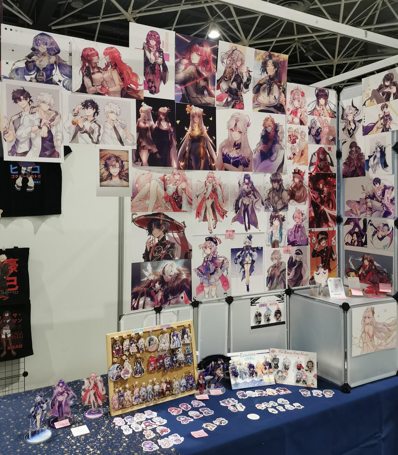 Items are divided into various categories, which all are accessible through the header: prints (paper printed illustrations), keychains (and charms), standees, photocards, stickers & misc.This can also act as my portfolio, thought it is missing some popular illustrations. If you're interested in my other arts, I'd recommend checking my socal media accounts instead (either Instagram or tumblr for illustrations, and bluesky for sketches and doodles).My previous fan booth/table in conventions: