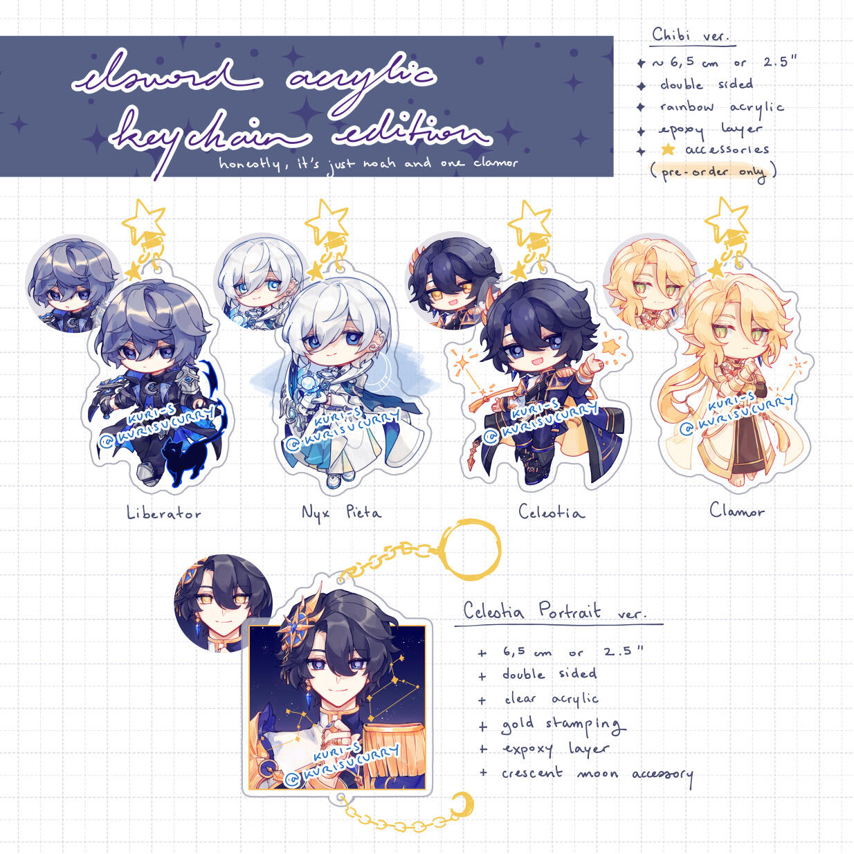 Exception: The Celestia Portrait (square shaped) is a clear acrylic with glitter epoxy keychain, with an additional crescent moon accessory at the bottom. The Nisha/Laby is a holographic clear acrylic keychain (7 cm), with an additional butterfly accessory at the bottom.π· Link Click