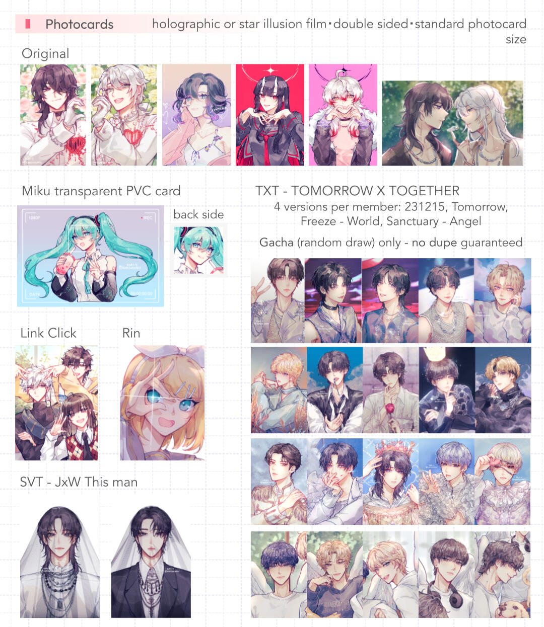 Fandoms: Original, Link Click, TXT, SVT, Vocaloid (transparent PVC card)Please note that the effect film on photocards can vary from holographic or frosted glitter, and can't be chosen.